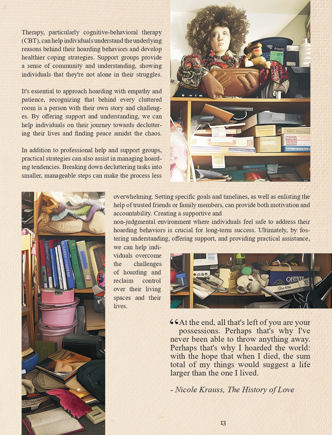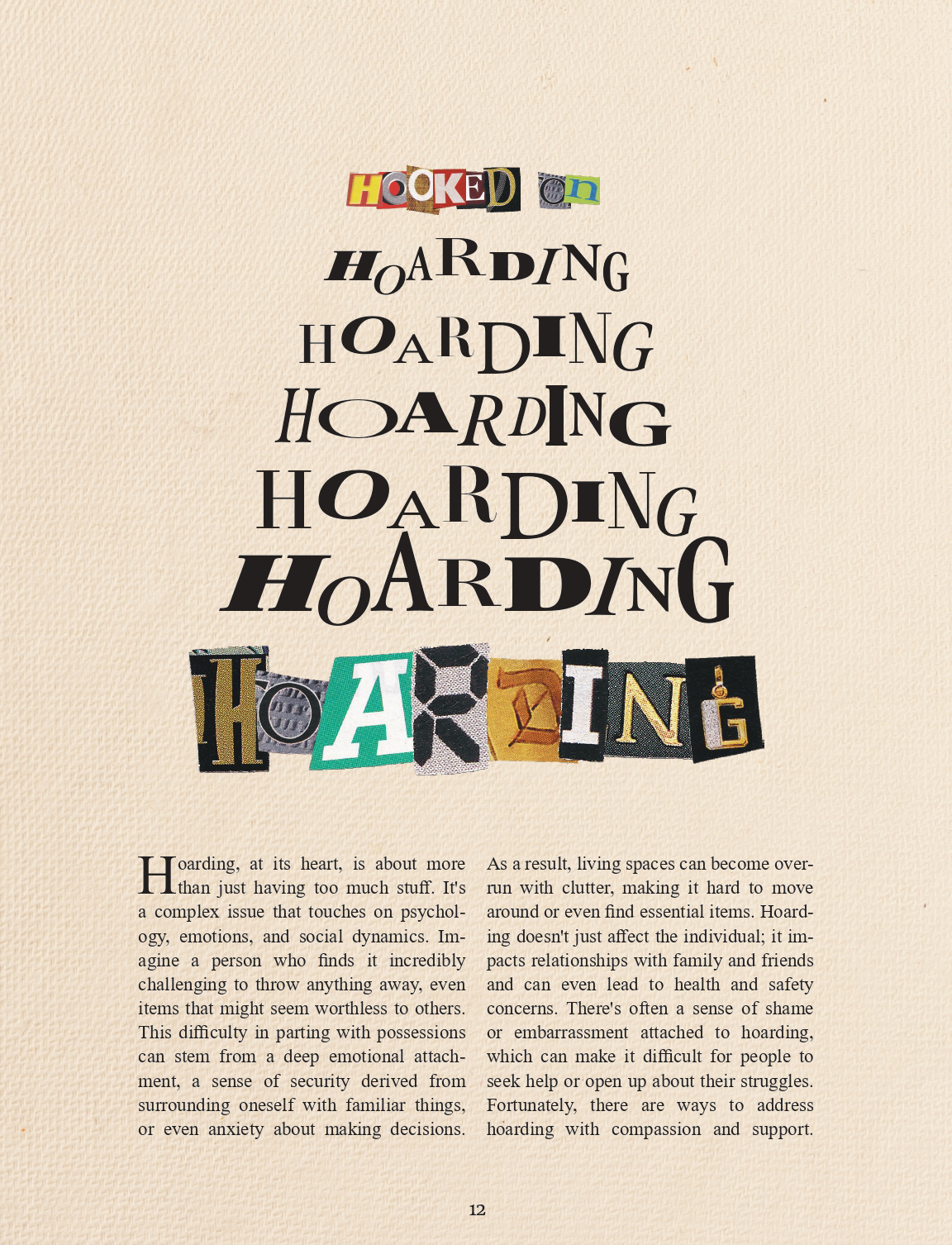 The spread below was my first "informative" spread in the magazine concerning the topic of hoarding. I wanted to create a sense of disorder in the design to fit with the theme it presents. That's what motivated the mixing of different character styles in the title, as well as the layout that follows where pictures are seemingly interrupting the running text, yet in an orderly fasion.