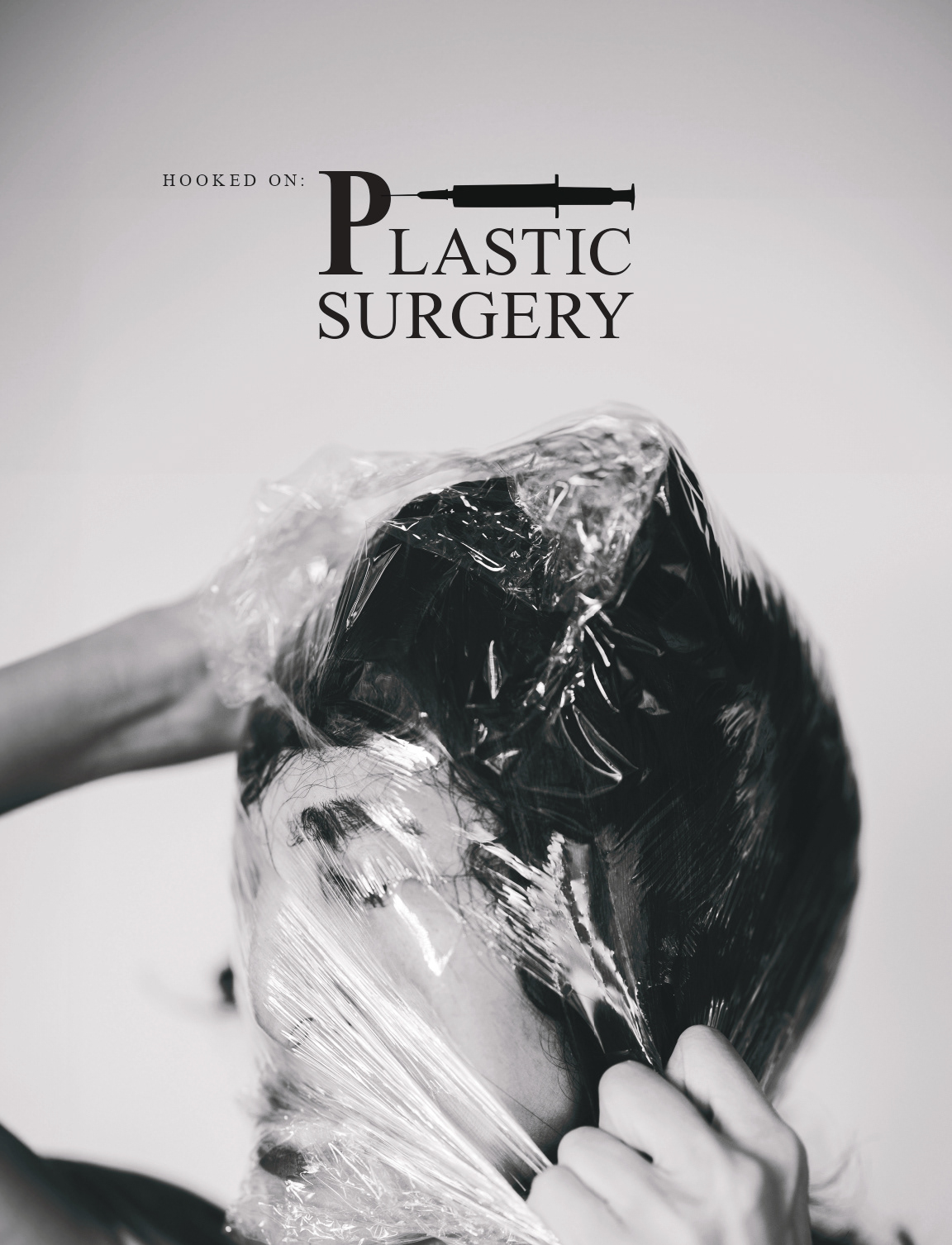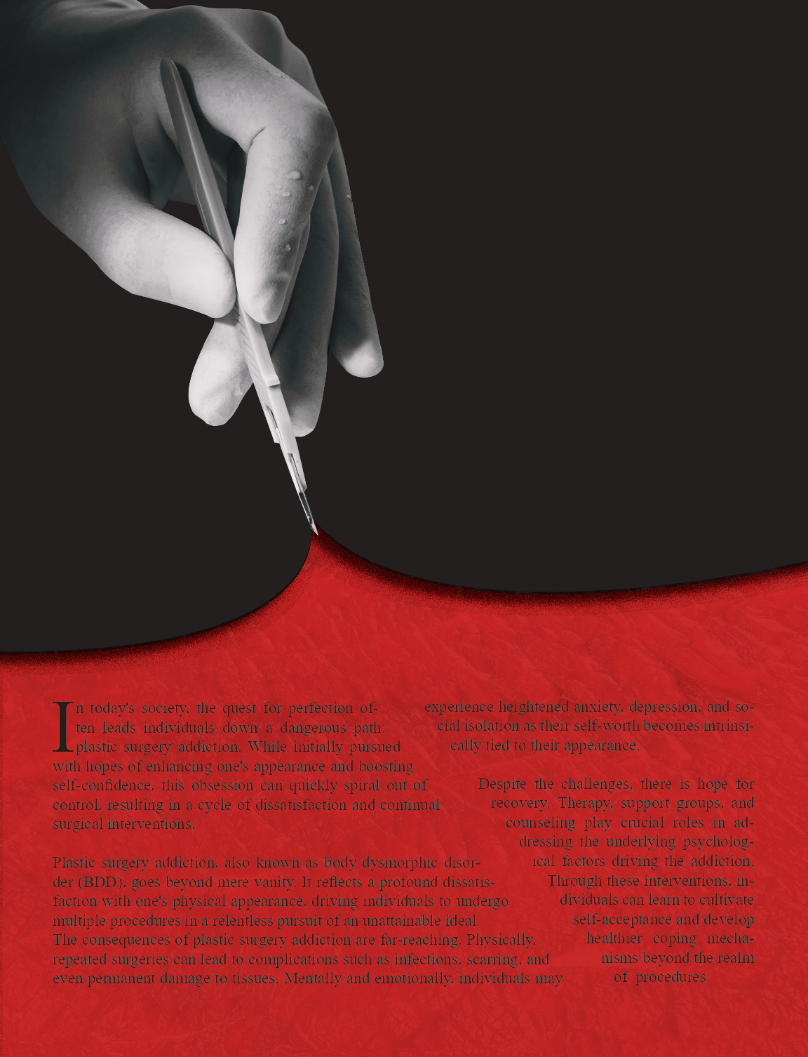 My next topic was that of Plastic Surgery addiction. With this design i wanted to create a feeling of uneasiness in the reader, entertaining the idea of wanting to flee your own body, or change it. The title was overlined with the syringe inflating the P while the running text is "cut up" and presented by the surgeon. A meaty texture along with some shadows was added behind the text making the spread more interesting to look at.